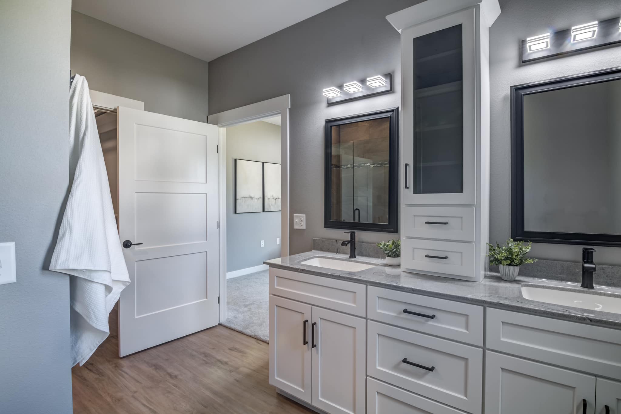 The large master bathroom features a custom tiled shower with a gorgeous glass door. A linen cabinet improves storage, and the double vanity hosts two sinks plus an additional cabinet and drawer between the sinks. We recommend double vanities where space allows because it makes getting ready for the day and prepping for bed easy and stress-free!