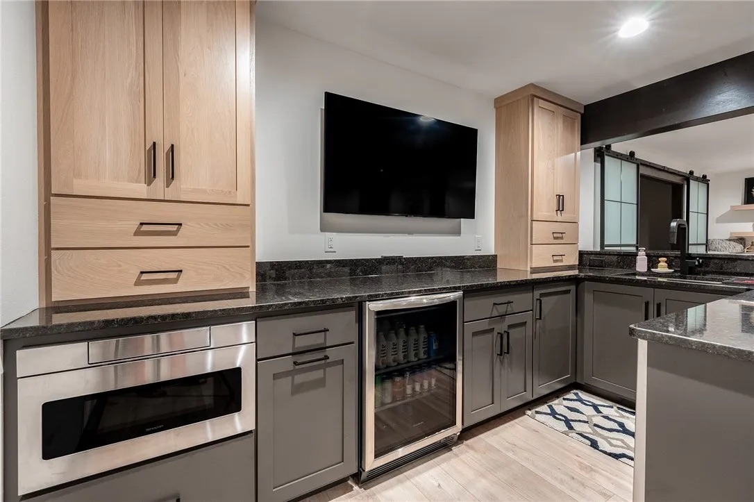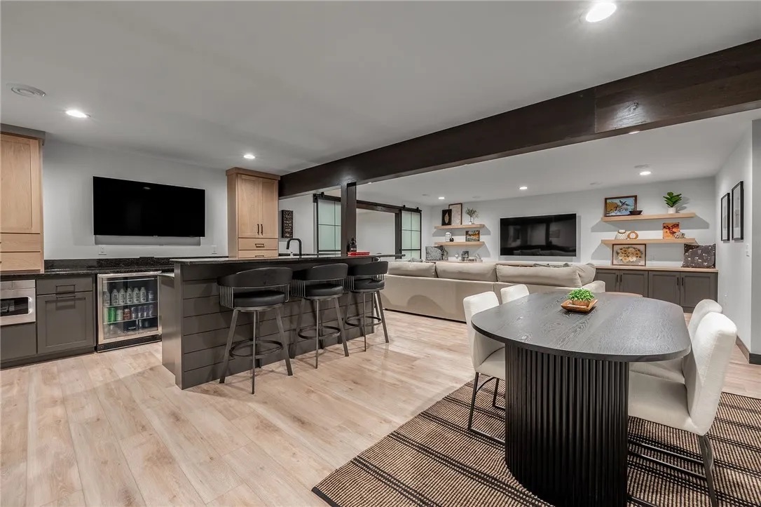 The client went with an overall modern color scheme with dark-painted cabinetry and beams contrasting with light flooring and furniture. Our experienced team created some functional yet stylish solutions, like frosted glass pocket doors between the basement living space and exercise room for privacy, custom cabinets for ample organization options, and quartz countertops throughout the home for durable, high-quality food prep surfaces.